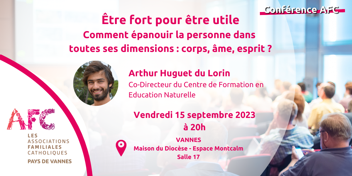Soirée de rentrée et Conférence « Être fort pour être utile : comment épanouir la personne dans toutes ses dimensions : corps, âme, esprit ? » Avec Arthur HUGUET du LORIN, Cofondateur du CFEN – Centre de Formation à l’Education Naturelle (Centre Hébertiste d’Orléans) Vendredi 15 septembre 2023 à 20h Espace Montcalm (maison du Diocèse) à Vannes